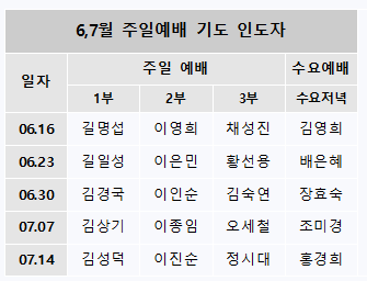 6,7월 주일예배 기도인도자