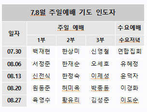 7.8월 주일예배 기도 인도자