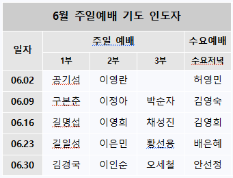 6월 주일예배 기도 인도자