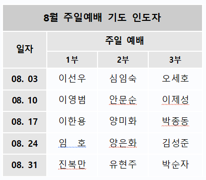 8월 주일예배 기도 인도자