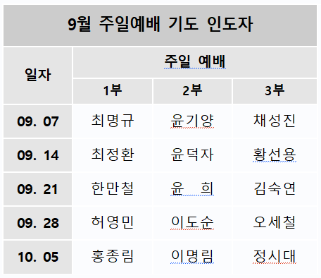9월 주일예배 기도 인도자